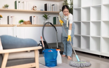 Bathrooms are scrubbed and polished, light fixtures, blinds, and ceiling fans are dusted,